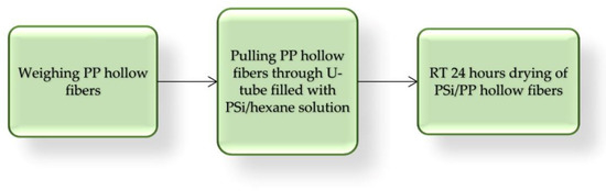 Next, capillary PP hollow fibers 1 m long and 2.26 mm diameter were coated with three PSi by simple pulling, repeated one, two, or three times in U-tube filled with 20 g 10% w/w hexane PSi solution. This simple lab procedure is presented in Figure 5 and some properties of obtained PP/PSi tubing are listed in Table 2.