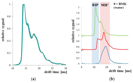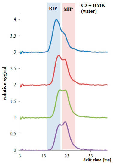 Measurements of BMK in water (BMK concentration 4.04 μg/mL) were performed with a drift tube ion mobility spectrometer (DT IMS) [23], designed and produced in the Military Institute of Chemistry and Radiometry, Poland. DT IMS has its own radioisotope 63Ni source and consists of two regions—ionization region and drift region, separated with a dosage screen. Obtained spectrum is composed of ionized carrier gas particles (so-called reaction ions, RIP) and ionized sample particles (MH+). The last ones can be hydrated and can exist as monomeric ions MH+(H2O)n and dimeric ions (M2H+(H2O)n. In the quantitative analysis, both the decay of reactive ion peaks and the raise of sample ion peaks were measured.
