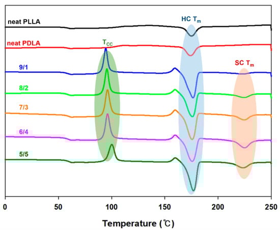 Accurate enthalpy calculations in DSC are important because the degree of crystallinity (Xc) can be calculated from the enthalpy value of the area under the DSC curve, and the Xc for each composition is shown in Figure 3. It is interesting to note that the area of both peaks depends on the PDLA content. The mass ratio 9/1 of the PLLA/PDLA blend showed the smallest crystallization exotherms. The total crystallization enthalpies of SC and HC of the PLLA/PDLA blends with mass ratios of 6/4, 5/5 were 65.44 J/g and 49.86 J/g, respectively. The Xc of the blends increased as the content of PDLA increased. Blends with a mass ratio of 6/4 had the highest PLLA crystallization enthalpy. Previous studies have found that the chain mobility of PLLA and PDLA have a significant impact on the competitive crystallization of SC and HC. Because SC crystallization requires alternative folding and packing of PLLA and PDLA chains, it only proceeds when both enantiomeric chains are diffused to the growth fronts [3,31]. Therefore, crystallization increases as the content of PDLA increase. However, in these results, when the blend ratio was PLLA/PDLA (6/4), it showed the highest crystallization than PLLA/PDLA (5/5). The reason for the highest crystallization at 6/4 rather than 5/5 seems to be due to the molecular weight of the PLLA and PDLA polymer. ΔHSC is greatly affected by the optical purity and molecular weight of the blended polymer as molecular weight decreases and optical purity improves, with the crystal phase co-existing SC and HC, and then finally only SC remains, and the overall crystallization is reduced [38,39].