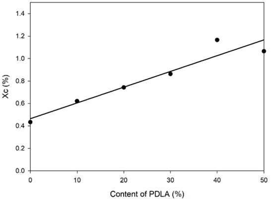 Degree of crystallinity (Xc) of the PLLA/PDLA blends with different contents of PDLA.