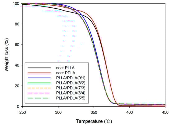 TGA thermograms of the PLLA/PDLA blends with various compositions.