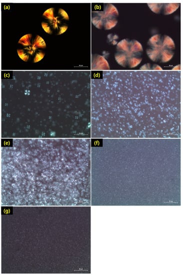Polarized optical micrograph of PLLA/PDLA blends with different ratio (a) neat PLLA, (b) neat PDLA, (c) PLLA/PDLA (9/1), (d) PLLA/PDLA (8/2), (e) PLLA/PDLA (7/3), (f) PLLA/PDLA (6/4), (g) PLLA/PDLA (5/5).