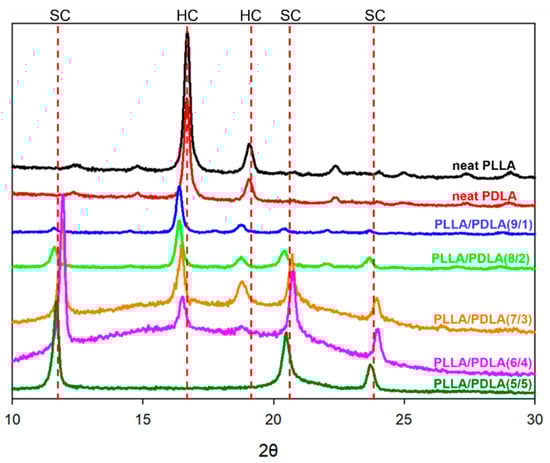 XRD curves of the PLLA/PDLA blends with various compositions.