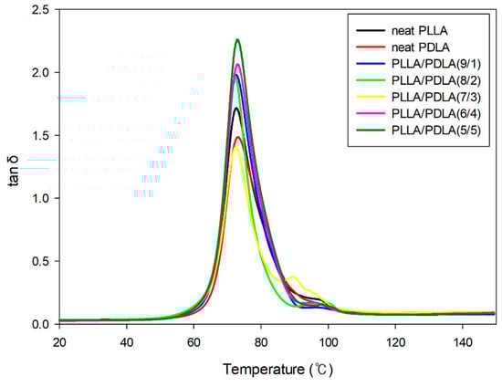 Loss factor tan δ curves with different compositions of PLLA/PDLA dependence of temperature.