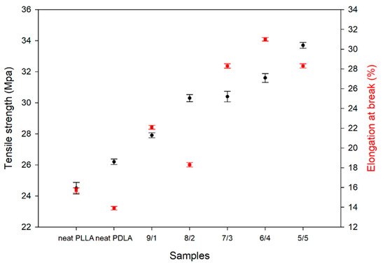 The tensile curve is characteristic of a brittle material, where there is no yield point or plastic deformation. Figure 9 provides the tensile strength and elongation at break curves for corresponding samples of different blending ratios. The yield stress is not given here, as it was comparable with that of tensile strength for all the samples. Neat PDLA had a higher tensile strength (26.2 MPa) than PLLA (24.5 MPa), but there was a small elongation at break (13.9%). The tensile properties of the blend samples were higher than those of neat PLLA and PDLA. The tensile strength of PLLA/PDLA (5/5) was the highest at 33.7 MPa, while elongation at the break was the highest in PLAA/PDLA (6/4). This indicated that the tensile strength gradually increased with an increase in the content of PDLA, but the value of elongation at break did not increase. These results explain the reason why E’ increased; the intermolecular stereocomplexation increased interaction. The formation of the SC structure in the PLLA/PDLA blend samples has a rigid property because numerous material characteristics impact the mechanical properties of polymers such as chemical structure, molecular properties, crystallinity, and molecular orientation. However, the most likely contributor to the slight differences in tensile strength and stiffness is crystallinity. Crystallinity is also known to have a strong influence on elongation.