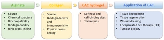 This review aims to provide a comprehensive review of CAC hydrogel and its application (Figure 1). Firstly, the characteristics of alginate and collagen will be given respectively, followed by presenting the properties of CAC and the techniques. Finally, the application of CAC in tissue engineering and biomedical sciences, especially tissue regeneration, wound dressing and encapsulated cell therapy, and tumor biology, will be described.
