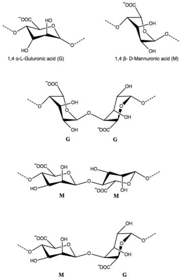 Alginate is a naturally occurring polysaccharide consisting of varying amounts of residues, including β-D-mannuronic acid (M) and 1–4 linked α-L-guluronic(G) [31]. Three different molecular structure patterns, including homogenous monomers (-GGGG-, -MMMM-) and alternating monomers (-MGMGMG-), are identified in alginates (Figure 2). M/G ratio and block length vary depending on the alginate source [32]. Up to now, over 200 alginate products are available in the market [32]. The mechanical properties of alginate are affected by the composition, length of the polymer chain, and molecular weight [33]. The molecular weight of alginate also varies with the sources. Increased proportion of G content in alginate and higher molecular weight can form strong mechanical properties.
