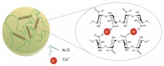 Schematic diagram of sodium alginate cross-linking by Ca2+. In the alginate containing −COO−group, Ca2+ exchanges with Na+ from guluronate block in ALG and interacts with separated ALG chains, forming the “egg-box structure”. Reproduced from [41] with permission. Copyright (2020) Springer Nature.