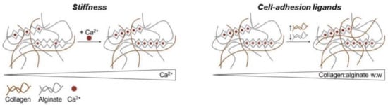 The relationship between the stiffness of composite hydrogel and calcium concentration and the association between collagen concentration and cell-binding sites inside the composite hydrogel. With the increase in Ca2+ concentration, the stiffness of composite hydrogel will be enhanced. Cell-adhesion ligands also increase as collagen concentration increases. Reproduced from [26] with permission, Copyright (2020) Elsevier.