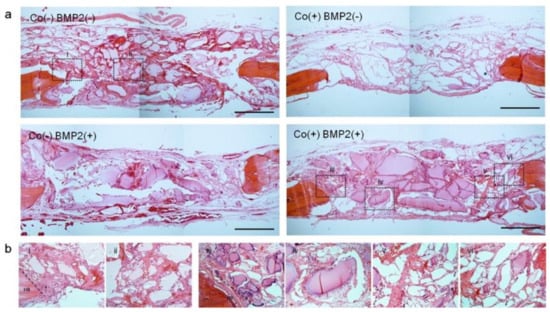 H&E stained sections of CAC implant in vivo after 6 weeks. (a) Low magnification image of CAC hydrogel groups including Co (−) BMP (−), Co (+) BMP (−) Co (−) BMP (+), and Co (+) BMP (+), (b) high magnification image of each groups. Reproduced from [89] with permission. Copyright (2015) Elsevier.