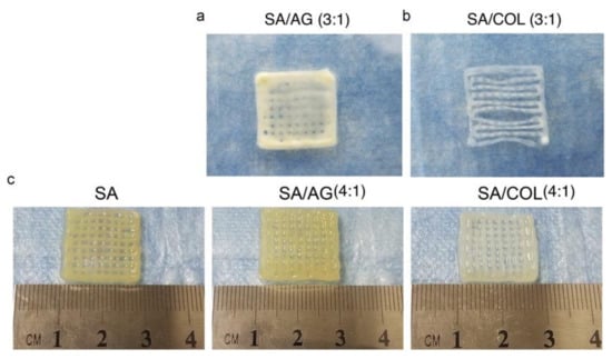 Small grids by 3D printing. (a) sodium alginate/agarose (3:1), (b) sodium alginate/collagen (3:1), and (c) sodium alginate, sodium alginate/agarose (4:1) and sodium alginate/collagen (4:1). Reproduced from [116] with permission. Copyright (2018) Elsevier.
