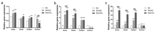 Expression level of genes including Acan, Sox9, Col2a1, and Col1a1 was determined by qRT-PCR. 3D constructs including SA, SA/AG and SA/Col in vitro after 3 days (a), 7 days (b), and 14 days (c). *, **, and *** indicated p < 0.05, p < 0.01 and p < 0.001 between SA/AG and SA/COL vs. SA. ### indicated p < 0.001 between SA/AG vs. SA/COL. Reproduced from [116] with permission. Copyright (2018) Elsevier.
