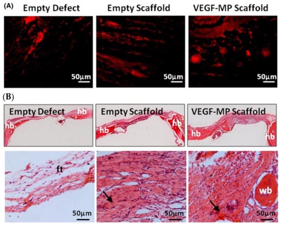 Immunobiological images of blood vessel formation and H&E sections. (A) Immunological images of endothelium labeled by CD31 (red). (B) H&E staining of empty defect, empty scaffold and VEGF-MP scaffold. HB, FT and WB for host bone, fibrotic tissue, and woven bone. Arrows indicated new bone formation. Reproduced from [135] with permission Copyright (2015) John Wiley & Sons, Ltd. Hoboken, NJ, USA.