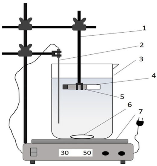 A static release experiment was performed at room temperature (around 30 °C). Figure 1 depicts the experimental apparatus for determining the static release of urea in water, emulating previous research [8,9]. A small magnetic stirrer bar (3 mm diameter and 6 mm long) was used to stir the samples at 50 rpm. SRF samples (3 g) were put into a tube, 25 mm long and 5 mm in diameter, with one end closed. The tube containing the SRF was placed horizontally in a glass beaker (150 mL) filled with 100 mL of water. Periodically, the urea concentration and the acidity (pH) of water were recorded. Urea was detected using a Genesis 20 Visible spectrophotometer (Thermo Scientific, Waltham, MA, USA) operating at a wavelength of 440 nm assisted by Ehrlich reagent. The urea concentration was calculated using a standard curve that correlated the urea concentration and absorbency value on the spectrophotometer reading. The degraded solids of SRFs were observed regarding their morphology via scanning electron microscopy (SEM), JEOL JSM-6360A (Tokyo, Japan), at 15 kV.