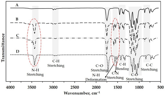 Only three peaks appear on the IR spectra of the SRF samples, i.e., around 3472 cm−1, 1585 cm−1, and 1560 cm−1 (Figure 2B, C and D). These peaks represent the groups of N−H stretching, N−H deformation, and C−N stretching, respectively [26]. Based on this analysis, the urea in slow-release fertilizer can be detected and proven qualitatively.