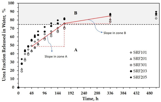 Figure 3 can be divided virtually into two zones (A and B). As seen, urea’s release appears to find the release equilibrium at around 75%. For all samples, the slope of urea release in Zone A is sharper than that in Zone B. This shows that urea was released rapidly in the first stage (Zone A), then the release rate tended to be slow in Zone B. For example, the fraction of released urea in Zone A for SRF101 changed by about 25% within 120 h (in the range of 48–168 h). In Zone B, it required a time of around 168 h (in the range of 168–336 h) to achieve an additional urea release of 12.5%. The increasing concentration of urea in SRF urged the urea release to be faster. After immersion for 96 h, the percentage of urea release reached about 59%, 66%, and 72% for urea concentrations of 1% (SRF201), 3% (SRF203), and 5% (SRF205), respectively. This phenomenon proves that urea, with its hygroscopic property, still existed and affected the release process.