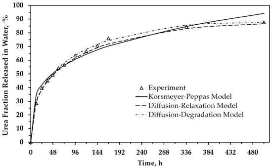 Some researchers have reported several mathematical models associated with the release mechanisms of an active substance from a matrix. These models were developed via different approaches, considering (i) only the diffusion and (ii) the combination of diffusion and other factors such as relaxation and erosion/degradation [22,23,28]. In this article, three mathematical models were used to analyze the release mechanism by fitting the curve of the fractional release, i.e., the Korsmeyer–Peppas model, the diffusion–relaxation model, and the diffusion–degradation model. We examined and verified the fit of the curves of the experimental data with these developed models. The proper model will be applied to describe the release mechanism and explain the studied variables, i.e., the molecular weight of poly(lactic acid) and the urea concentration in SRF.