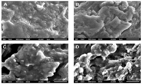 Figure 6A shows the SRF201’s morphology before the process of urea release. The distribution of micro-sized urea is evenly distributed in the PLA matrix with little aggregation being formed. This indicates that the stirring process can disperse the urea. After immersion for 96 h (see Figure 6B), several holes appeared to be forming, showing a degradation of the polymer matrix. The holes became enlarged and the degradation effect became more visible with increasing immersion times of 168 h (Figure 6C) and 504 h (Figure 6D). The existence of these holes may be caused by (i) the initial degradation of PLA in the amorphous area or (ii) the release of urea aggregate (if any) in the SRF samples.