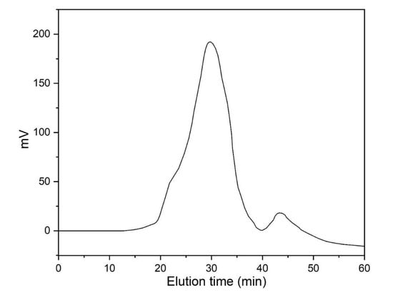 The average molecular weights (Mn and Mw) and polydispersity index (Ð = Mw/Mn) of the synthesized polymers were calculated and the results are presented in Table 2. The chromatogram of novolac 5a is presented in Figure 3.