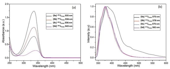 (a) UV–visible spectra of 9a–d in acetonitrile solution; (b) normalized fluorescence spectra of 9a–d at a concentration of 1 × 10−6 M in acetonitrile solution.