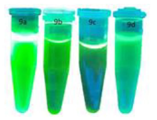 The excited state behavior of naphthalimide analogs 9a–d was evaluated by recording their fluorescent emission spectra in acetonitrile solutions (emλmax = 375–382 nm). As shown in Figure 4b, all the naphthalimide analogs showed a similar range of emission, which is slightly red-shifted to emλmax = 382 nm in the case of compound 9d. The spectrum of this compound also exhibits a shoulder at emλmax = 411 nm, which is due to the presence of the electron-withdrawing NO2 group in the 5-position of the naphthalimide ring, reducing the π–electron conjugation between the chalcone spacer and the naphthalimide aromatic ring. Table 3 summarizes the photophysical properties of naphthalimides 9a–d. In addition, Figure 5 displays the fluorescence emissions of these compounds upon exposure to UV light.