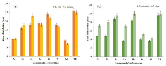 Antimicrobial efficiency of compounds 5a–c and 9a–d. (a) Zone of inhibition of tested bacteria, i.e., E. coli MTCC 25922 and S. aureus MTCC 25923. (b) Zone of inhibition of tested fungi, i.e., C. albicans MTCC 282 and A. niger MTCC 227. Results are expressed as mean ± SD for n = 3. Bars with the same letter are not significantly different at p > 0.05.