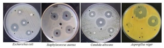Antimicrobial activity of compound 9b against common bacterial pathogens. a: 50 µL, b: 75 µL, c: 100 µL, d: positive control, e: negative control.