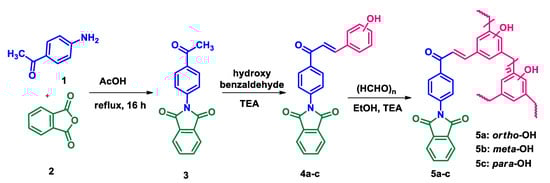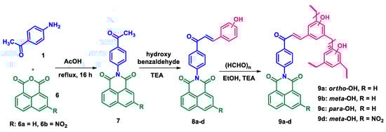 The synthesis of phthalimide analogs 5a–c and 1,8-naphthalimide analogs 9a–d was performed as depicted in Scheme 1 and Scheme 2, starting from key materials 1 and 2 and 1 and 6, respectively. Initially, 2-(4-acetylphenyl)isoindoline-1,3-dione (3) and 2-(4-acetylphenyl)-5-substituted-1H-benzo[de]isoquinoline-1,3(2H)-dione (7) were synthesized according to a literature procedure [24] by the reaction of the corresponding aromatic anhydride with 4-aminoacetophenone in acetic acid under reflux. In the second step, the required chalcone was obtained by aldol condensation and subsequent dehydration of 1,3-diones 3 and 7 with various substituted aromatic aldehydes in ethanolic solution in KOH medium. The obtained crude products were dissolved with hot ethanol and recrystallized to produce chalcones 4a–c and 8a–d. These chalcones underwent polymerization by the reaction with formaldehyde in a ratio of 1:8 in the presence of triethylamine (TEA) in ethanolic solution at 65 °C under N2 atmosphere, producing phenolic-formaldehyde resins 5a–c and 9a–d in 50–56% yields.