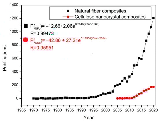 Correlations of the publications by the year of the natural fiber composites and cellulose nanocrystal composites.
