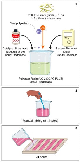 Schematic fabrication of unsaturated polyester composites reinforced with CNCs.