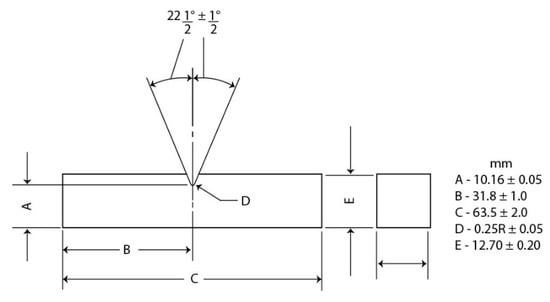 Izod tests were carried out at RT for each CNC composition in a Pantech Instruments (São Paulo, Brazil), using a 11 J hammer pendulum. Prismatic standard [] notched specimens with a depth of 2.54 mm and an angle of 45° were fabricated using a Notchvas model CEAST carver. Four samples for each percentage of CNCs with dimensions of 62.5 × 12.7 × 10 mm were produced. Figure 3 shows schematics the specimens of the Izod tests.