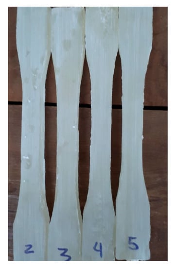 Tensile tests were conducted at RT on four standard [] specimens for each CNC composition in a model DL 10.000 EMIC universal machine, (São José dos Pinhais, Brazil), operating with cross-head speed of 1 mm/min until the specimen ruptured using a 1 kN load cell. Typical specimens prepared for the tensile tests are shown in Figure 4.