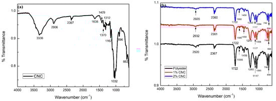 FTIR spectra of (a) plain CNC and (b) polyester nanocomposites, as well as neat polyester.