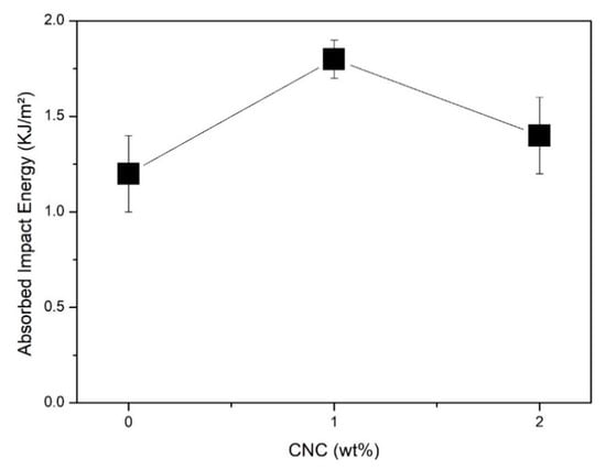 Regarding these findings in CNC-reinforced polyester nanocomposites, it is worth mentioning that Bindal et al. [] reported a much lower impact strength of polyester reinforced with 20 wt% of glass fiber. A question that may arise from the results in Figure 6 is the reason for the decrease in impact strength in going from 1 to 2 wt% of CNCs. According to Peng et al. [], nanocomposite impact strength decreases with increasing additions of CNC, which may be due to the agglomeration of nanoparticles. Therefore, as evidence in Figure 6, there is no need to reinforce a polyester matrix with more than 2 wt% of conifer fiber CNC to obtain a significant impact strength to compete with nanocomposites reinforced with inorganic nanoparticles or fiberglass at cost-effective conditions.
