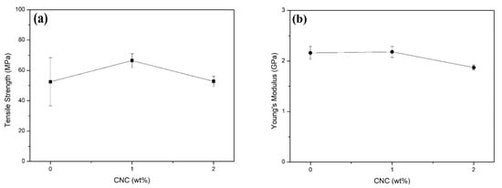 It is worth mentioning that Kargarzadeh et al. [] found no increase in both tensile strength and Young’s modulus with the incorporation of 2 wt% kenaf fiber CNC compared to an unsaturated polyester matrix. The authors did not investigate 1 wt% CNC nanocomposites.