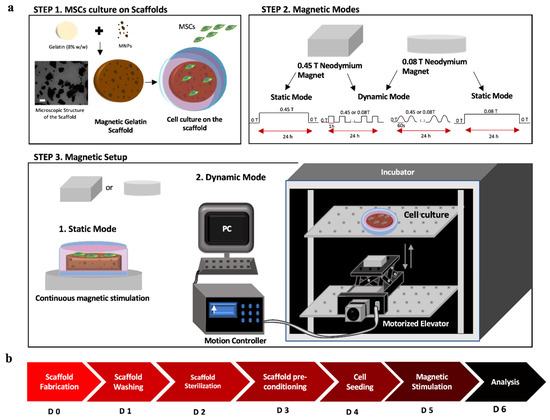 (a) Schematic setup for static and dynamic magnetic field modes using neodymium magnets of different intensities. Step 1: Scheme of the scaffold components (gelatin 8% w/w and MNPs), microscopic image of the MNPs distribution on the scaffold (scale bar: 100 µm), and MSCs cell culture on top of the mGelatin. Step 2: Configurations of the magnetic variation cycles and frequencies used in each condition (dynamic and static mode). Step 3: Setup of the position of the magnets on the bottom of the culture plate (1) and (2) configuration of magnets on top of the lab jack elevator to stimulate the cell culture inside the incubator. (b) Timeline for the stages of the experiment, from the scaffold fabrication to the readouts after the magnetic exposure of the MSCs.