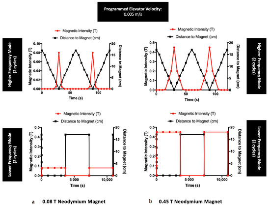 Magnetic profiles of the neodymium magnets (with a maximum intensity of (a) 0.08 T and (b) 0.45 T) used for the experiments with MSCs exposed to dynamic regimes, under a steady velocity of 0.005 m/s. Each frequency is represented with two cycles concerning the distance between the magnets and the cell culture plate, during a total magnetic exposure of 24 h.