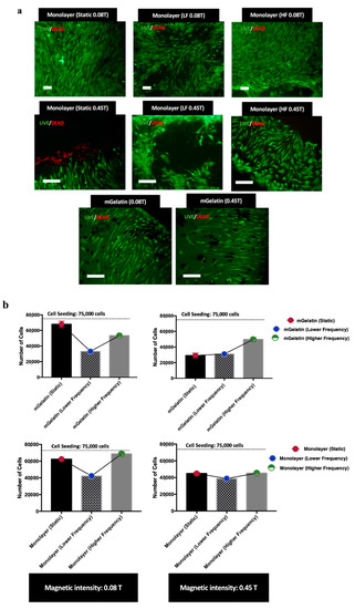 Nonetheless, it was curious to observe that the response of MSCs cultured in TCP to magnetic field was substantially different. In this case, cell death was only detected in MSCs cultures exposed to a static 0.45 T magnetic field (Figure 3a), whereas an irregular cell distribution, denoted by the presence of empty regions (regions without cells), was observed for MSC cultures exposed to dynamic regimes at higher magnetic field intensity (0.45 T). Furthermore, MSCs showed the capacity to align when exposed to static and HF dynamic magnetic field, but poor cell orientation when exposed to LF dynamic regimes (Figure 3a).