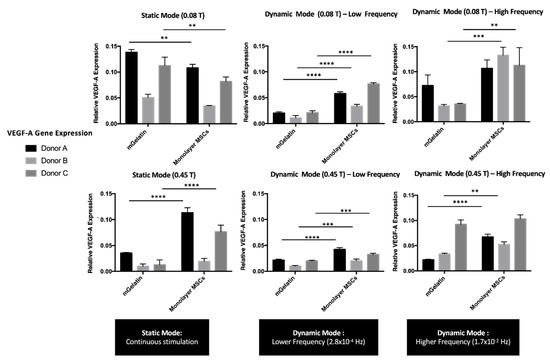 VEGF-A expression values using RT-PCR technique to compare the effect of static and dynamic modes (low and high frequency magnetic field) and magnetic intensities (0.08 T and 0.45 T) over MSC secretome. Relative expression of VEGF-A from MSCs cultured on mGelatin scaffolds, in comparison with monolayer MSCs as a control condition, using three MSC donors (A, B, C) under independent conditions. Data are presented as means ± SD. Statistical significance was determined using two-way ANOVA: **p < 0.01 a very significant result, ***p < 0.001 a highly significant result; and ****p < 0.0001 an extremely significant result.