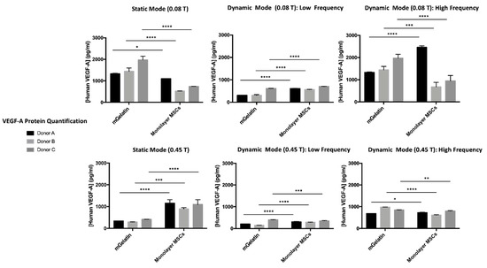 VEGF-A protein quantification for MSCs cultured on mGelatin and control condition (MSCs cultured on monolayer) for each experimental condition (static, lower, and higher frequency magnetic field) and corresponding donor (A, B, C), according to the magnetic intensity (0.08 T and 0.45 T). Three MSC donors (A, B, C) were used under independent conditions. Data are presented as means ± SD. Statistical significance was determined using two-way ANOVA: *p < 0.05 indicates a significant result; **p < 0.01 a very significant result; ***p < 0.001 a highly significant result; and ****p < 0.0001 an extremely significant result.