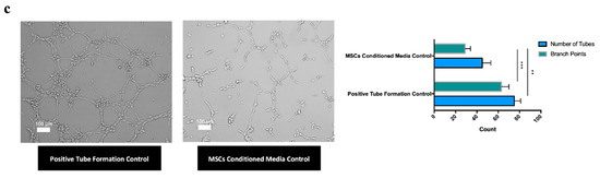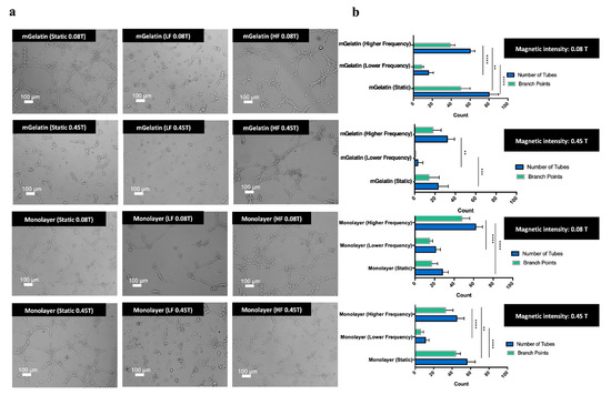 Contrastingly, the use of the secretome obtained from MSCs exposed to static magnetic field conditions at 0.08 T led to a more intense sprouting effect, resulting in the formation of the highest number of tubes (80 tubes on average) and branch points (48 branch points).