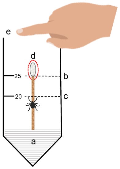 Vertical bioassay setup: A cotton swap is inserted in a Falcon tube and secured at the base with a polystyrene platform (a). The base of the cotton swap tip is aligned with the 25 mL line (b); the tick is released at the bottom of the cotton tip just below the 20 mL line. The timer starts when the tick crosses the 20 mL line (c); the treatment is applied on top of the swab (d); the observer exposes a finger on the open top of the Falcon tube to stimulate the tick to climb the slender surface (e).