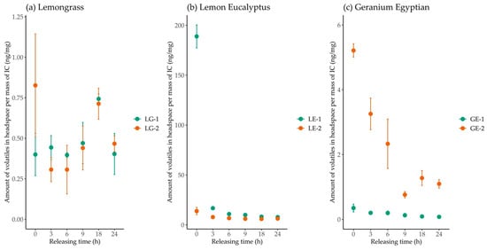Mass (ng) of essential oil (EO) volatiles per mg of inclusion complex ± standard error (SE) released at 0, 3, 6, 9, 18, and 24 h. Inclusion complexes were stored on a watch glass at 10–20% humidity and room temperature for the indicated times. Volatiles released by 10 mg (lemongrass (LG) and geranium Egyptian (GE)) or 5 mg (lemon eucalyptus (LE)) of inclusion complexes in 20 mL vial were analyzed by SPME/GC-MS and quantified using liquid standard curves of respective essential oil in hexanes.