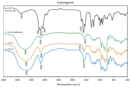 FT-IR spectra of lemongrass (LG) essential oil, β-cyclodextrin, and inclusion complexes LG-1 and LG-2. Spectra were obtained from 400–4000 cm−1 with a resolution of 3.857 cm−1 as an average of 32 scans on a FT-IR spectrophotometer.
