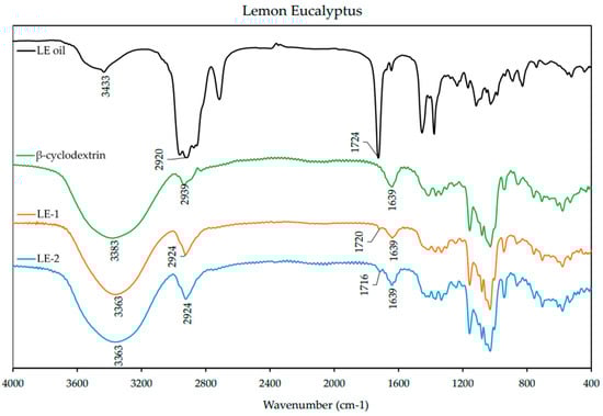 FT-IR spectra of lemon eucalyptus (LE) essential oil, β-cyclodextrin, and inclusion complexes LE-1 and LE-2. Spectra were obtained from 400–4000 cm−1 with a resolution of 3.857 cm−1 as an average of 32 scans on FT-IR spectrophotometer.