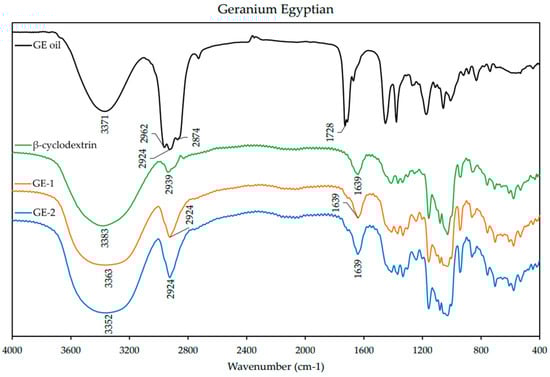 FT-IR spectra of geranium Egyptian (GE) essential oil, β-cyclodextrin, and inclusion complexes GE-1 and GE-2. Spectra were obtained from 400–4000 cm−1 with a resolution of 3.857 cm−1 as an average of 32 scans on an FT-IR spectrophotometer.