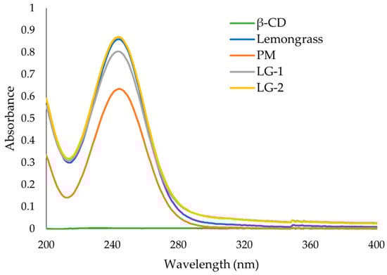 UV-Vis spectra of β-cyclodextrin (β-CD), lemongrass (LG) essential oil, physical mixture of both (PM) and the inclusion complexes LG-1 and LG-2. Solutions were prepared in water and have the same β-CD or essential oil concentration where applicable.
