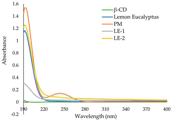 UV-Vis spectra of β-cyclodextrin (β-CD), lemon eucalyptus (LE) essential oil, physical mixture of both (PM) and the inclusion complexes LE-1 and LE-2. Solutions were prepared in water and have the same β-CD or essential oil concentration where applicable.
