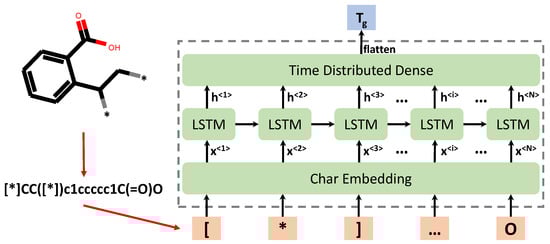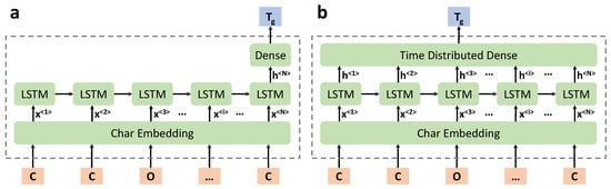In the natural language processing field, word-level or char level models can be applied as sentences are composed of words [65,66]. However, for polymer repeat units, only ‘word’ structure exists, i.e., SMILES strings. Thus, in this work, the char level RNN model is formulated to learn the chemical language of polymers in the SMILES notation. As shown in Figure 1, the pre-processing step is to split the SMILES string into a list of individual chars, which are then tokenized into integers and fed into the embedding layer of the DL model.