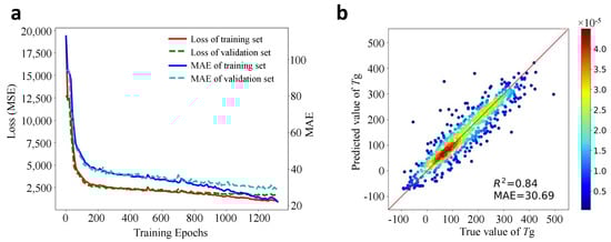 After the DL model is well-trained, new predictions can be made easily on the test dataset. The correlation coefficient score and the MAE can then be calculated based on the predicted and true values of , which is plotted in Figure 5b. One can see that the majority of the scatter points locates in the unity red line, indicating the predicted values are close to their true values. Quantitatively, the developed DL model gives a correlation score and MAE = 30.69 °C. This performance is reasonably well and comparable with many other ML models for prediction in terms of MAE values or score [24,37,38,39,79], which confirms the effectiveness of the chemical language processing model. Note that in most previous works, the polymer samples were not large and only certain types of polymers were studied [36], the MAE and score may be higher. While in this work, the data size is very large and the types of polymers in the database are very general.